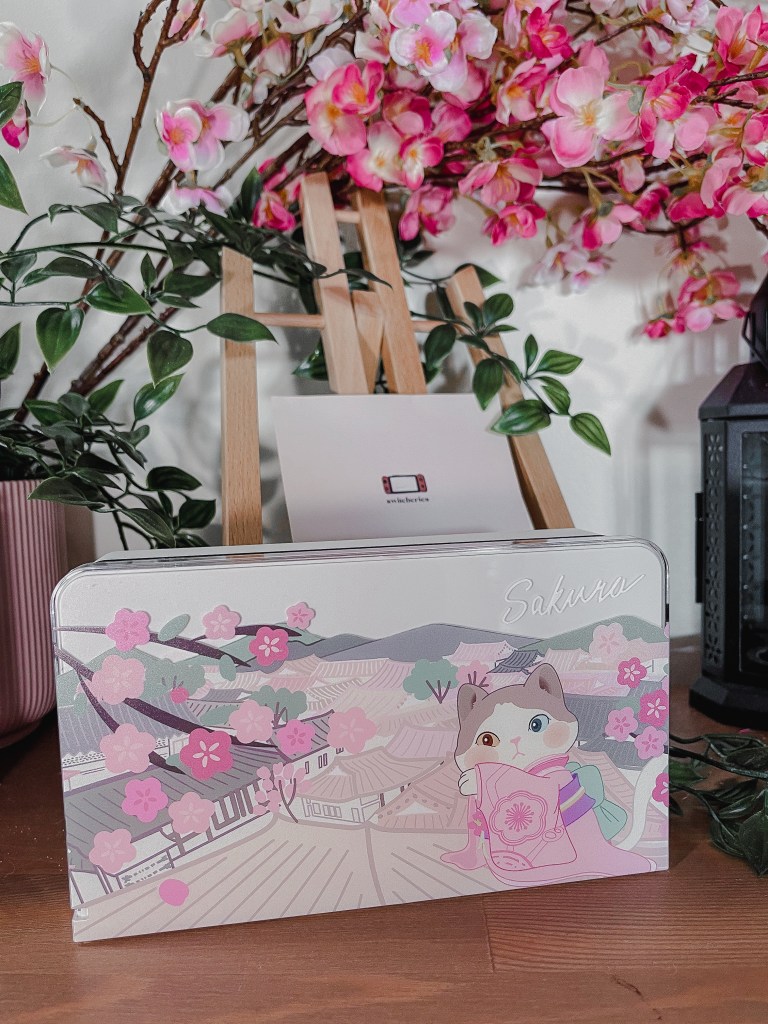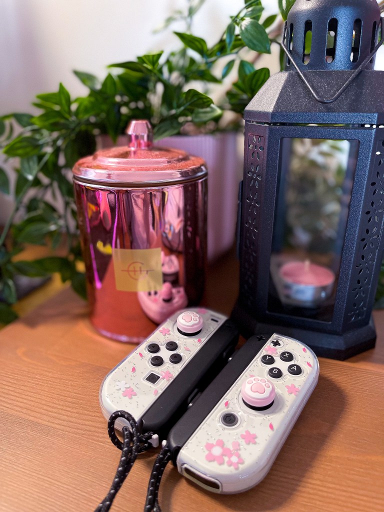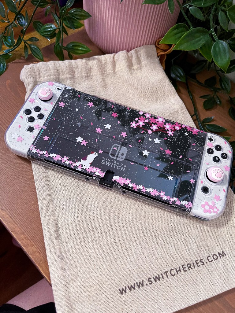 I love the sleek design of the Nintendo Switch OLED with the black colour of the body and the crisp white of the Joy-Cons, so I wanted something to compliment those colours without hiding the sleek design of the Nintendo Switch OLED console. So, when I saw the Sakura Crystal Case, I just HAD to get it. The transparent case allows me to still see that beautiful sleek design of the Nintendo Switch OLED that I love, while also adding some minimal yet beautiful style with the pink Sakura and the glitter (and that cute little kitty cat booping its nose on a falling flower).