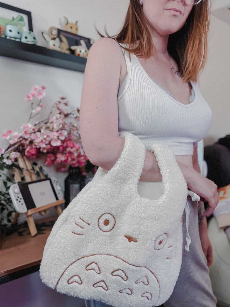 This Totoro bag is so cute and soft and is the perfect daily accessory. I can easily fit in my Nintendo Switch, my game cartridge case for multiple games on the go, a notebook, a couple of pens, my iPad, airpods, and a snack. However, if you follow my Instagram, then you will know that I mostly use this bag to hold all my snacks at my desk.
